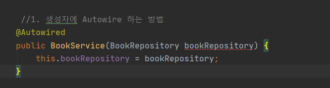 생성자에 Autowired를 하여 사용할 수 있다. 위에서 보이는 BookReposiory에 @Repository로 컴포넌트 생성을 한 후, 빈 주입을 해줄 수 있다.