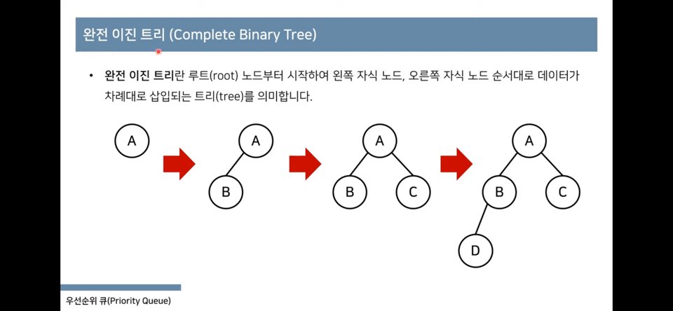 완전이진 트리란 자식노드가 '순서대로' 또는 '차례대로' 삽입되는 이진트리