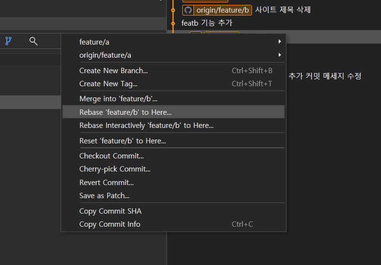 Rebase '리베이스하고 싶은 브랜치' to Here 기능이 있습니다. 해당 옵션을 선택하면 Merger Conflict 경고 창이 뜰거에요. 당황하지 마시고 충돌을 해결해주면 되는데요.
