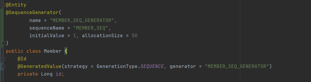 allocationSize (default 50) 은 시퀀스 한번 호출에 증가하는 수를 지정해놓은 것이다. 즉 DB 1번 갔다 올 때마다, 시퀀스 값이 50을 가져와서 메모리에 쌓여있는 시퀀스값을 사용한다.