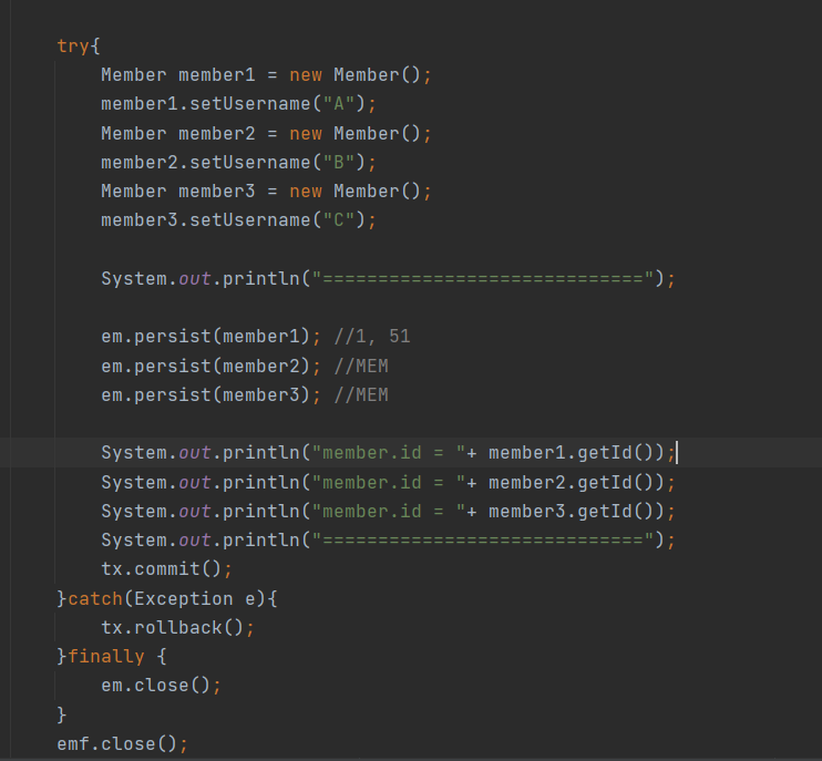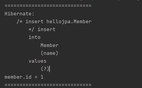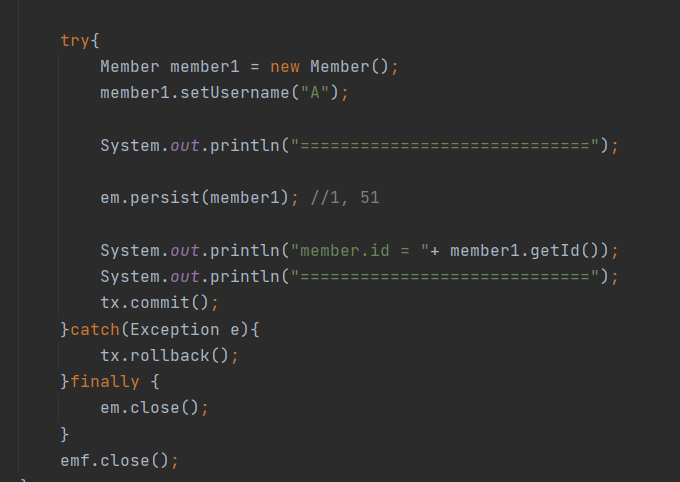 해당 코드는 member1에 id값을 할당하지 않고 persist 하는 코드이다.