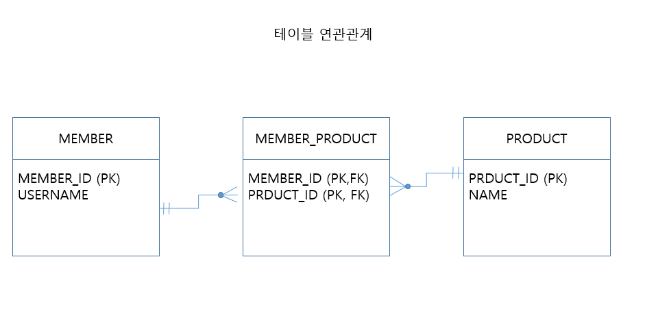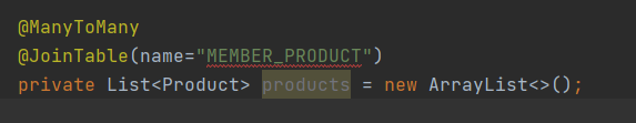 특이한건 주테이블에 @JoinTable(name="MEMBER_PRODUCT")인데 MEMBER_PRODUCT라는 중간 테이블을 생성하여 연결해주는 방식을 사용한다.