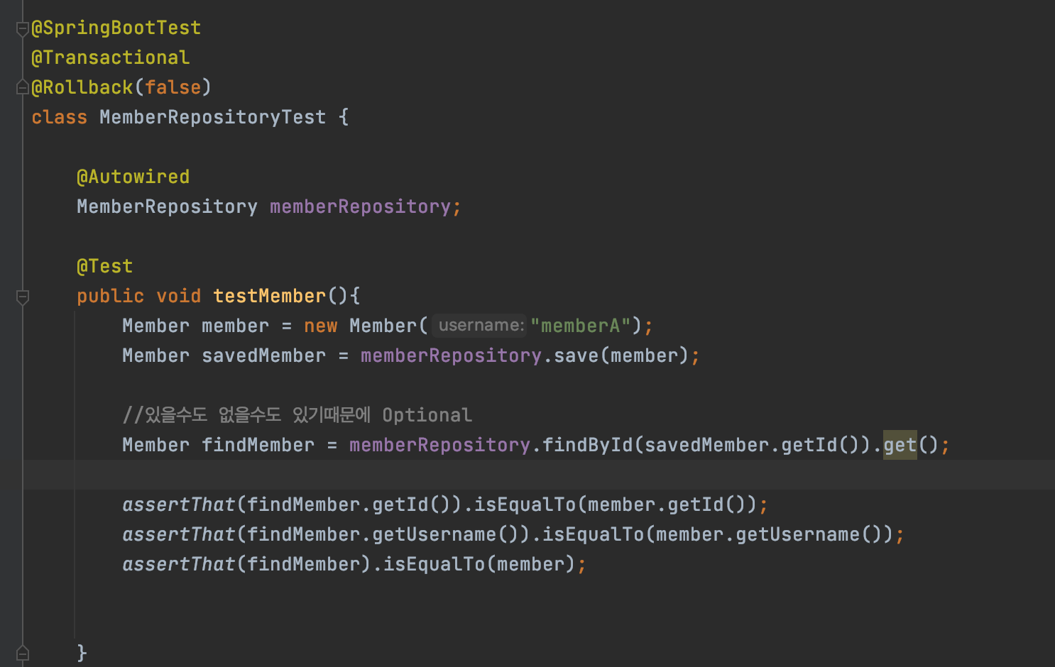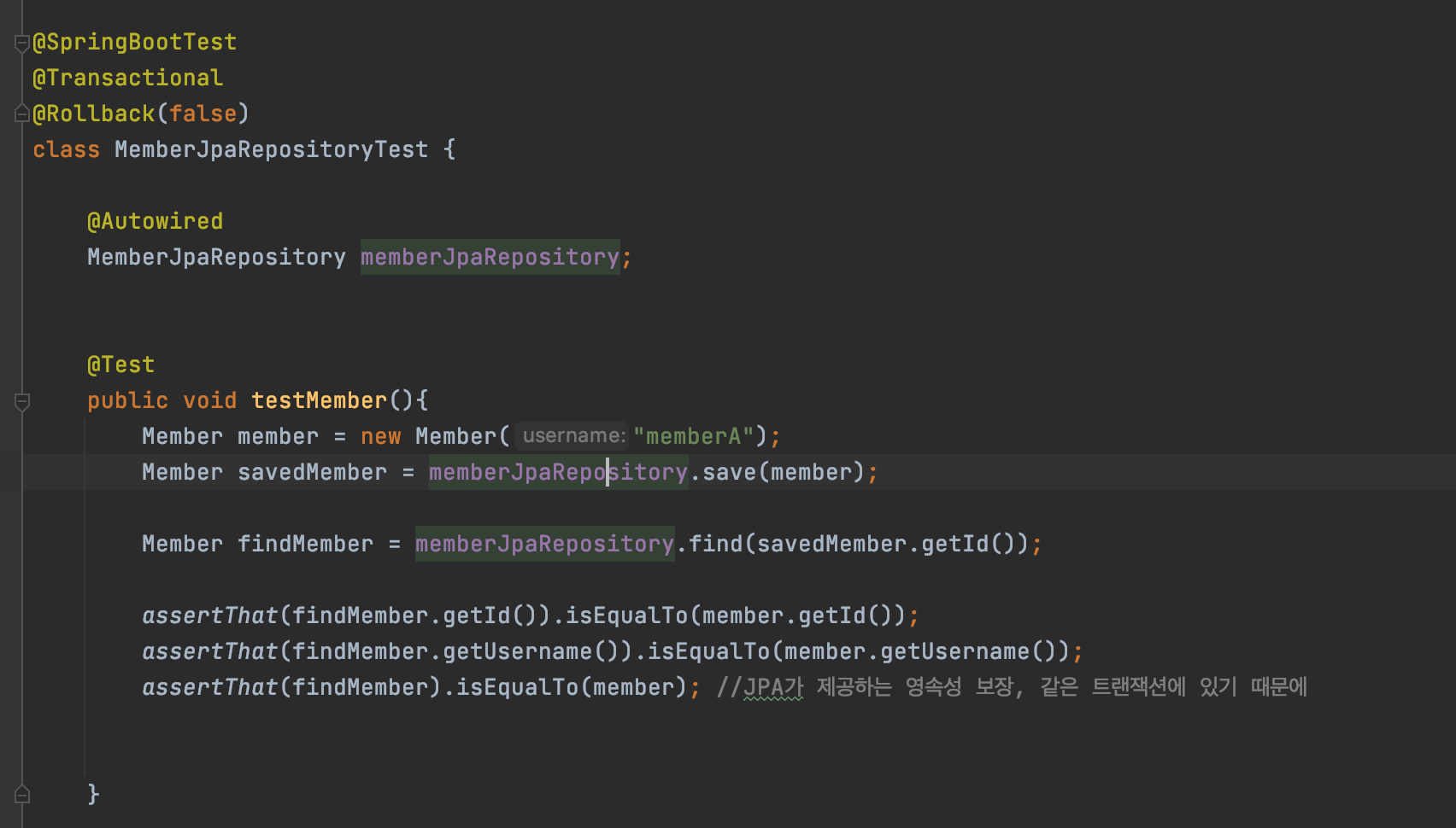 assertThat(findMember).isEqualTo(member) 의 경우 , 같은 트랜잭션 안에서는 영속성 컨텍스트의 동일성 보장을 하는 JPA 특징이다.
