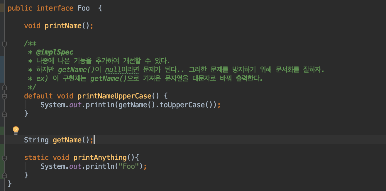 default 키워드로 위와 같이 특정 기능을 제공을 할 수 있다. 구현체가 모르게 추가된 기능에 따라 그만큼 리스크가 따르기ㄷ 떄문에 @implSpec과 같은 자바독 태그를 사용하여 문서화를 하도록 하자.