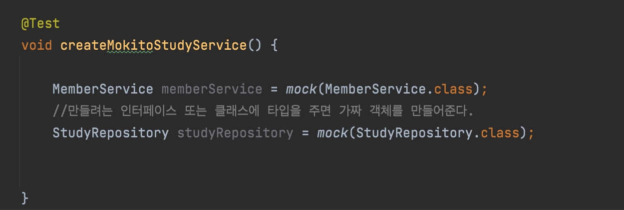 StudyService에 대한 Test를 하나 만들어보자. 우리는 아직 구현체가 존재하지 않기 때문에 Test에서 memberService, studyRepository를 의존 주입을 받아도 구현체를 작성해야한다. 이런 경우 우리는 Mocking을 통해 주입을 받을 수 있는데 크게 2가지 방법이 있다.