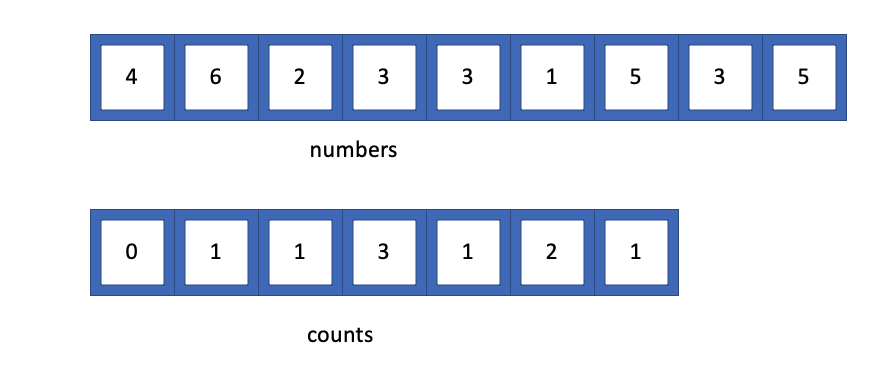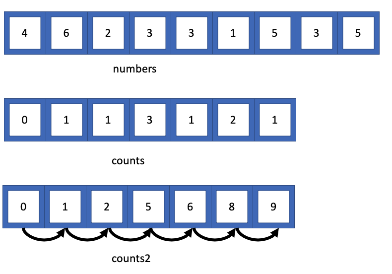 위 그림처럼 [4,6,2,3,3,1,5,3,5]를 가지는 numbers 배열의 값들을 개수대로 counts 배열 인덱스에 저장을 해둔다.